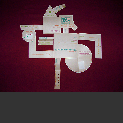 | "Festival Recollections" is a timepiece which chronicles my experiences at Bonnaroo Music and Arts Festival in 2007. The piece explores the ways in which print media can provide interactivity and engage the viewer. Twelve memories which stand out most from the festival are combined to form a construction which can be explored sequentially. When folded, the piece is a simple geometric shape with no text or images visible. Each piece folds out, revealing a memory from the festival, and creating a visual effect which becomes more and more complicated. Each individual memory is depicted textually - the day, time, and location within the festival grounds are specified, and additional text highlights what stands out most about that event or memory. The aesthetic of the piece aims to capture some of the feeling of Bonnaroo - the jumble of text and shapes mimics the disorganization of my memories; the events blur together and so my memories are not wholly sequential. The color palette is also chosen to fit the mood of the festival; bright colors are used to represent the energy and happiness of the crowd, but the sandy background which mutes them somewhat calls to mind the ever-present dust and dirt of the grounds. To add to the interactivity of the piece, some components include other features - an archway that pops up, an envelope of confetti, a tiny booklet. | ||||||