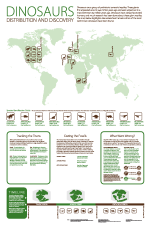 | This informational poster highlights many ways of conveying information, including maps, charts, a timeline, illustrations, and text. The objective of the poster is to convey a large quantity of information as efficiently as possible. The topic of the poster is dinosaurs, and for ten of the most well-known dinosaurs it shows areas in which fossils have been found and the time period in which the dinosaur lived, as well as a brief overview of the various species. Additional information boxes add background about the information gained from dinosaur tracks, fossil dating, and mass extinction events. |