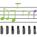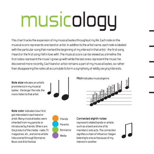 | This informational poster is a concept map of my musical interests as they have evolved over time. Each band or artist which makes up a significant portion of the music I listen to is represented as a musical note. Size, color, pitch, and connections encode various qualities of each artist such as genre, their prominence within the music I listen to, and the way in which I discovered them. These notes are placed upon a musical score which forms a timeline; the most recent artists I have discovered are at the far right end. This score therefore stretches on to form a five foot scroll documenting my musical tastes. |