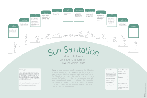 | This informational poster provides step-by-step instructions for performing the Sun Salutation, a common yoga routine. The poster aims to present instructional information in the most efficent manner possible. Simple diagrams illustrate each pose in the routine while concise instructions provide additional information. The poster also includes background information, practice tips, and information about the health benefits of yoga. |